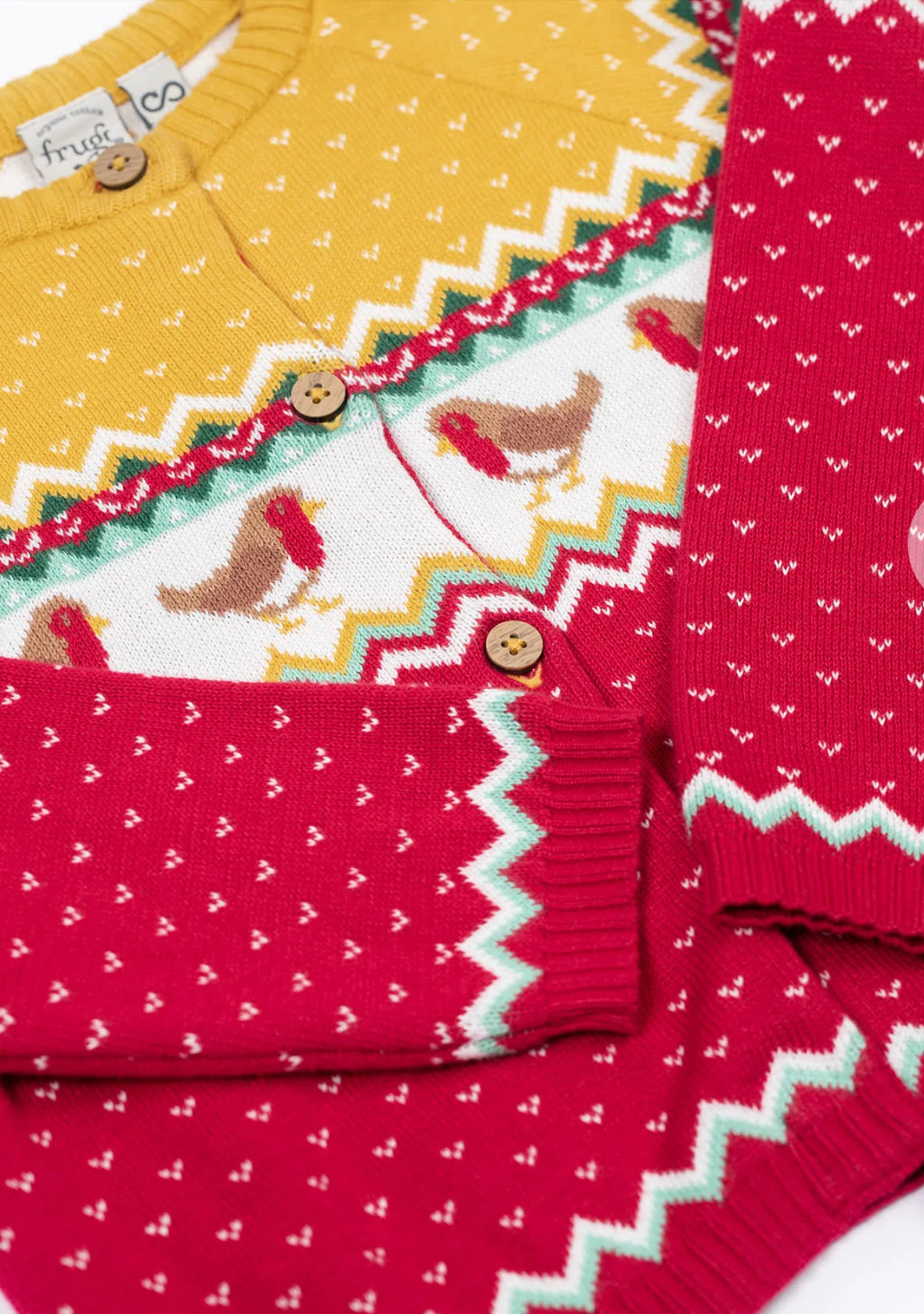 Featuring a charming Fair Isle-inspired Frugi print, this long-sleeved cardigan has three button fastenings at the top for easy on and off, whilst the stretchy rib cuffs and hem keep the fit comfy and cosy.