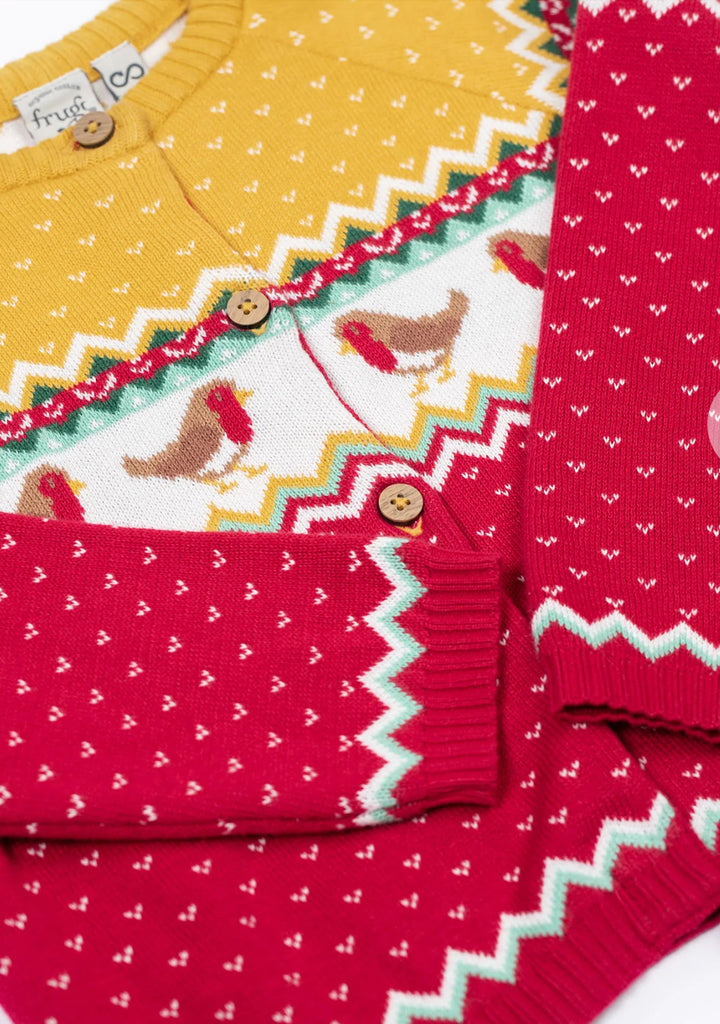 Wrap them up in warmth with our Carol Cardigan! Made from organic cotton jacquard, with soft ribbed trims at the neckline, hem and cuffs, this snuggly knit is super soft and cosy, and perfect for layering on chilly days.