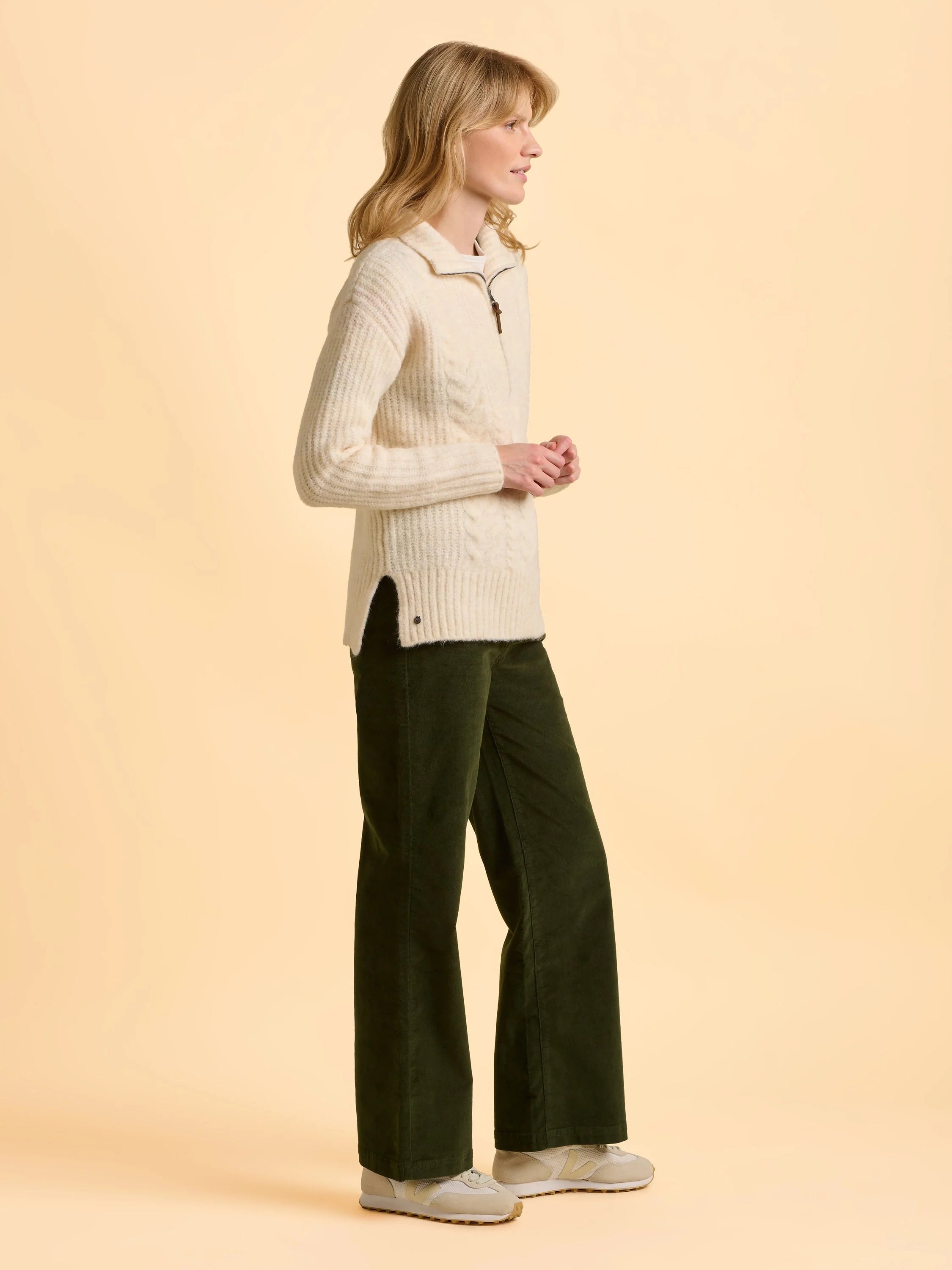 A cozy go-to for cooler days, this cream quarter-zip jumper offers a fitted shape with knitted details down the front. The thick ribbed hem and side slits add comfort and ease, making it a reliable staple for your winter layering essentials. Pair with colour or keep it simple with denim.