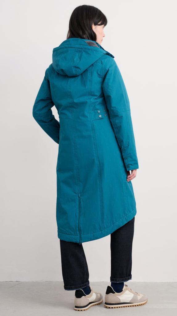 Made to last from year to year, our much-loved Janelle raincoat has a recycled nylon Tide Cycle® outer. Its relaxed shape allows for plenty of cosy layers underneath, and it falls to the knee for extra coverage. The upper half is lined with soft recycled fleece, while quilted lining at the bottom gives you ease of movement as well as warmth. Designed for the Cornish elements, the detachable hood has a peak to protect your face, and there are reflective strips for cloudy days and nighttime walks.