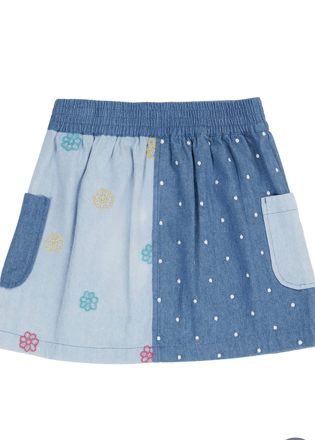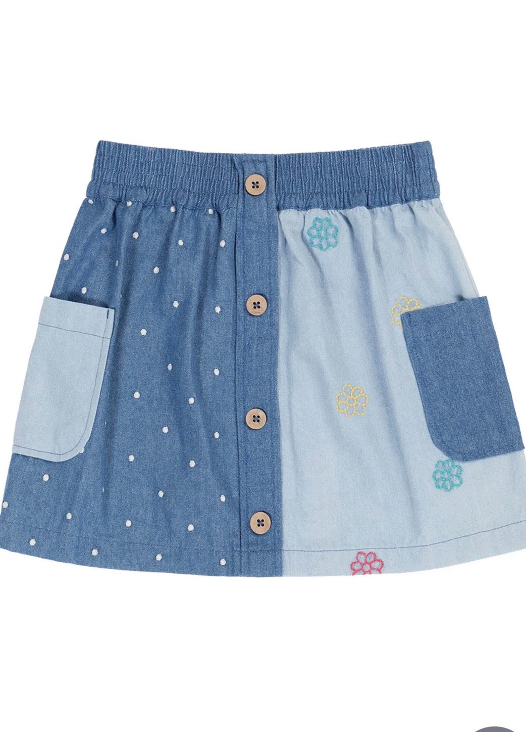 Meet the Hotchpotch Denim Skirt – crafted from super soft and lightweight organic cotton denim, this skirt features bright and colourful Frugi embroidery that adds a playful touch. Designed with a comfy elasticated waistband, pretty gathers, mock button details, and handy side pockets, it’s a fun and easy choice for everyday adventures.