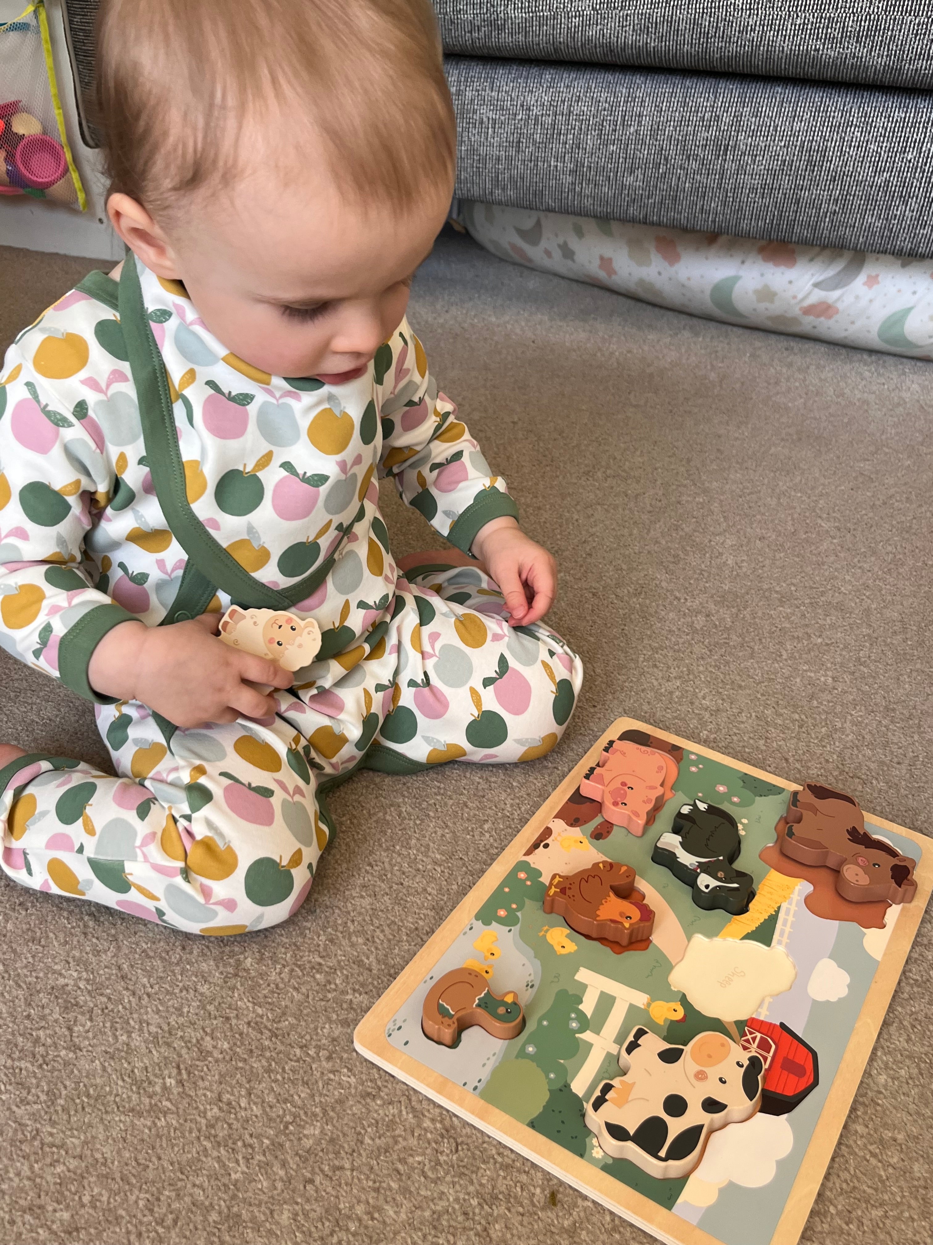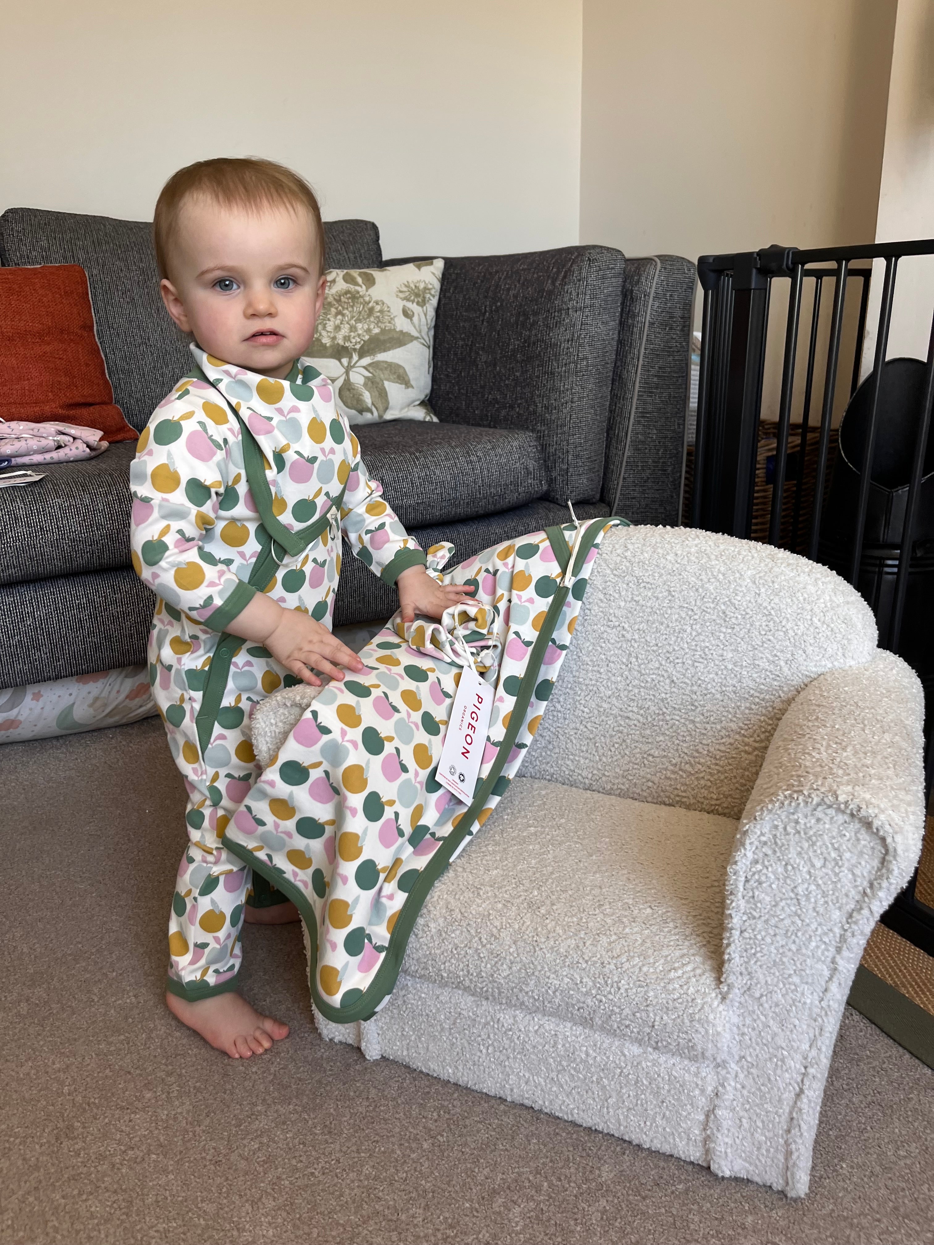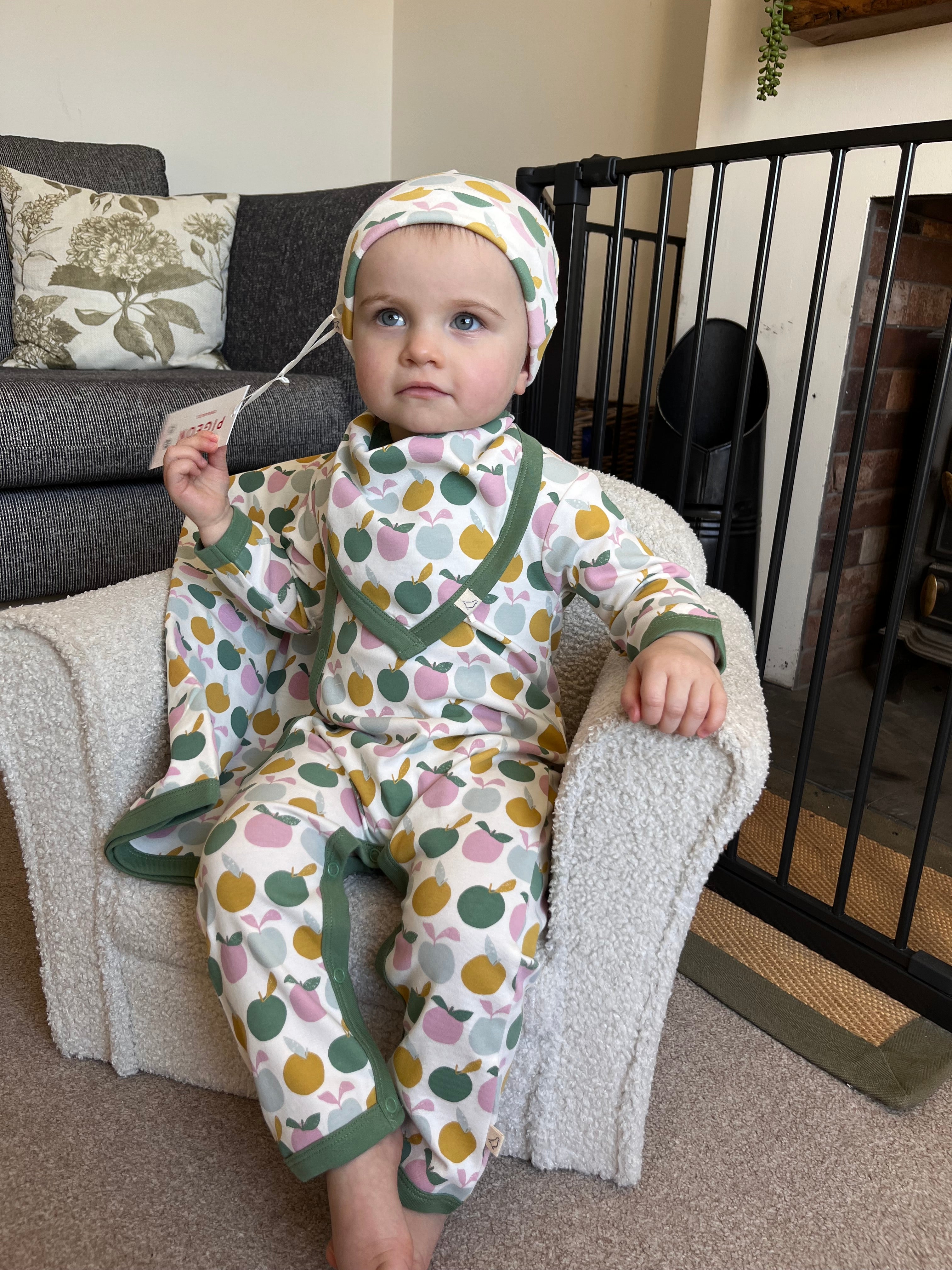 Our classic kimono-style romper with diagonal opening and poppers between legs. Cuffs at feet, to keep closed when babies are small and unfold as they grow. Built-in scratch mitts.