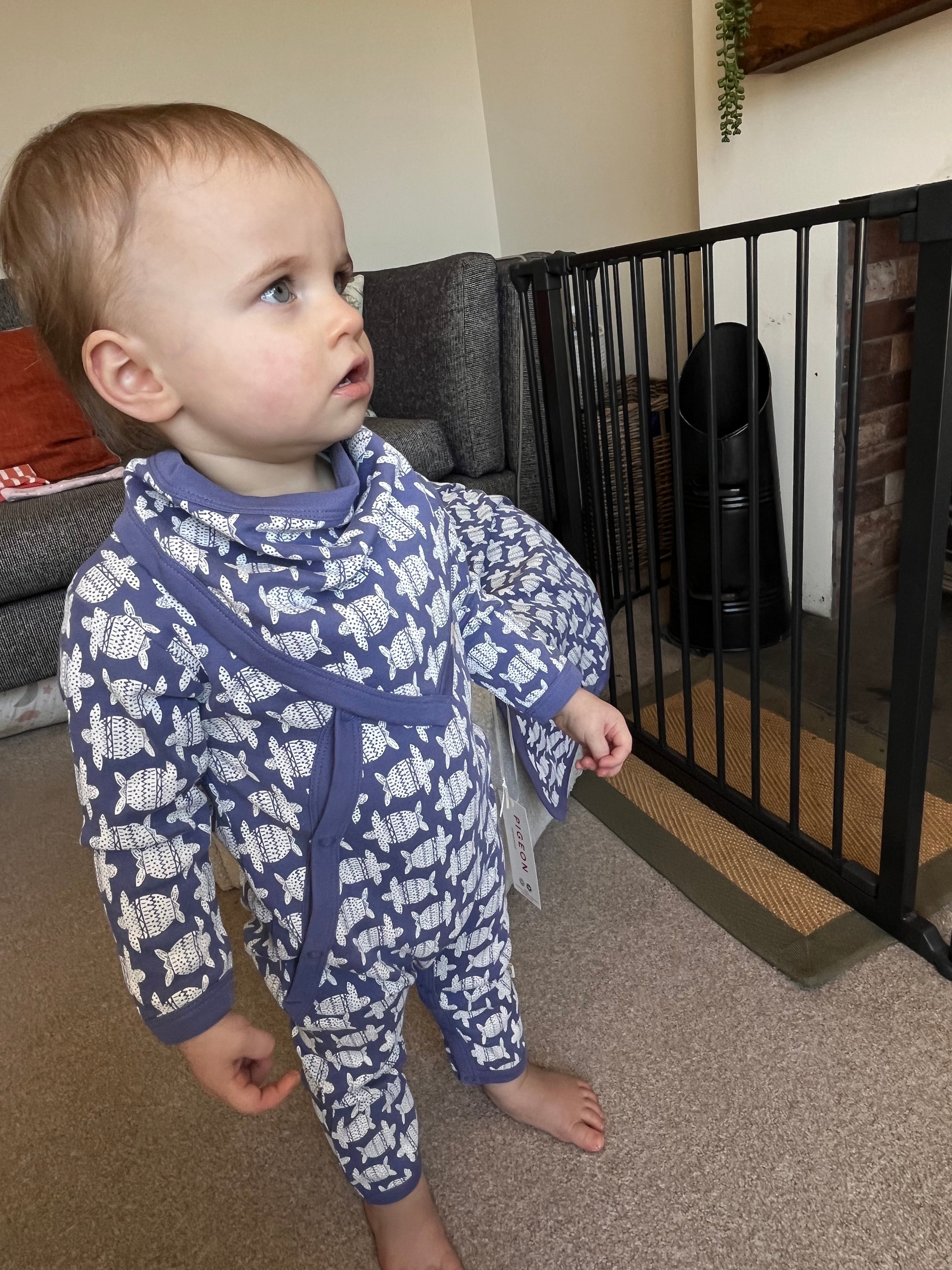 Our classic kimono-style romper with diagonal opening and poppers between legs. Cuffs at feet, to keep closed when babies are small and unfold as they grow. Built-in scratch mitts.