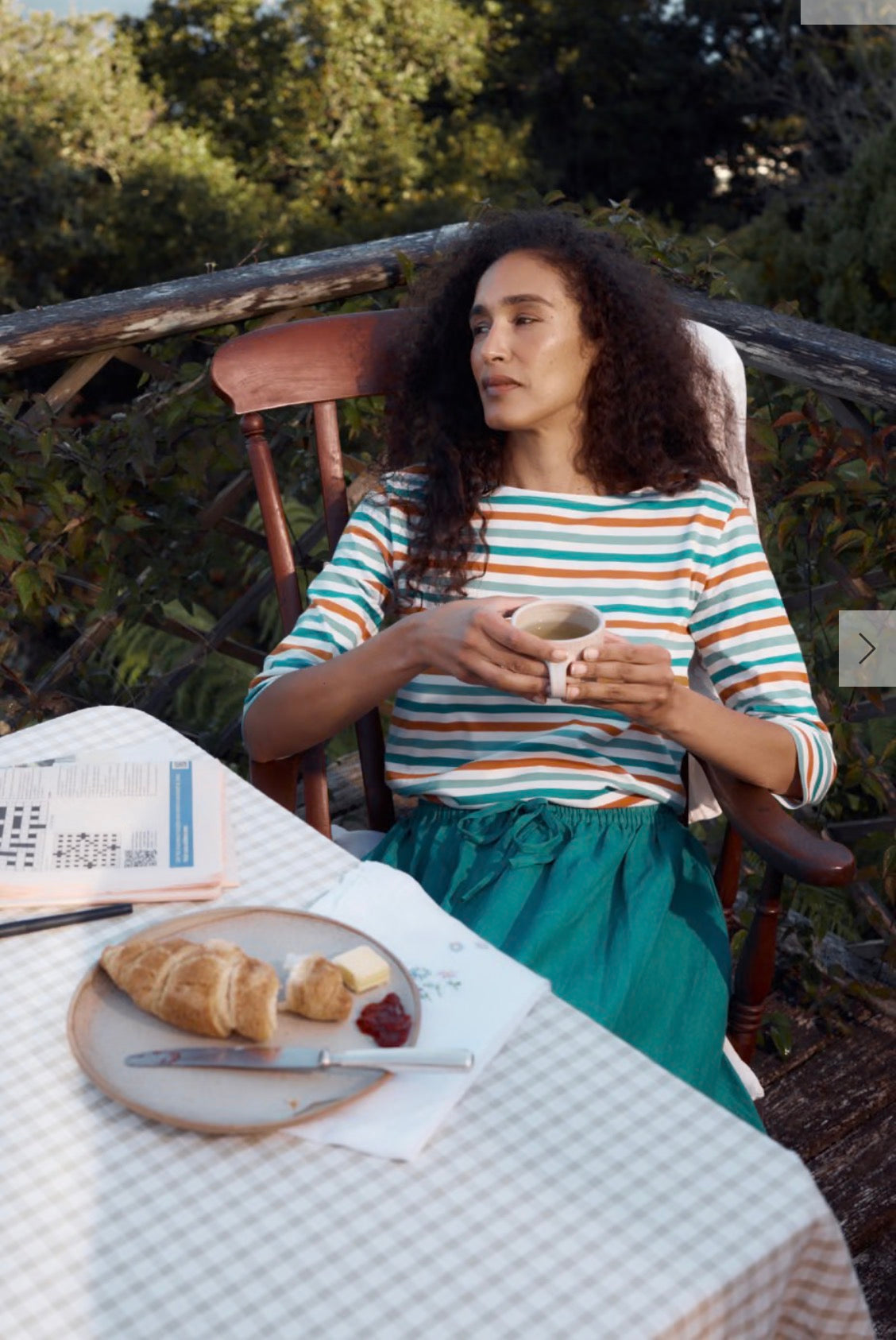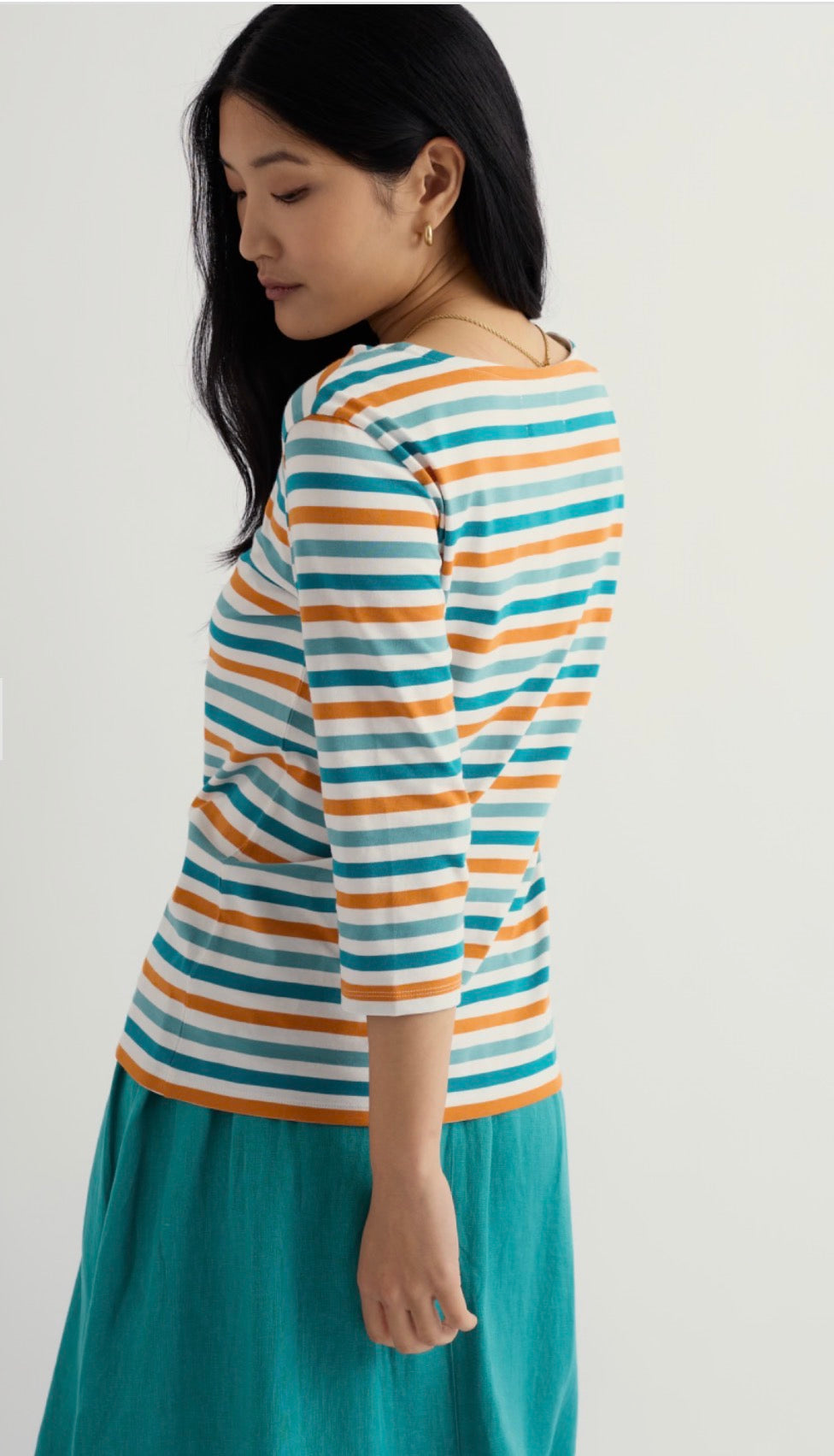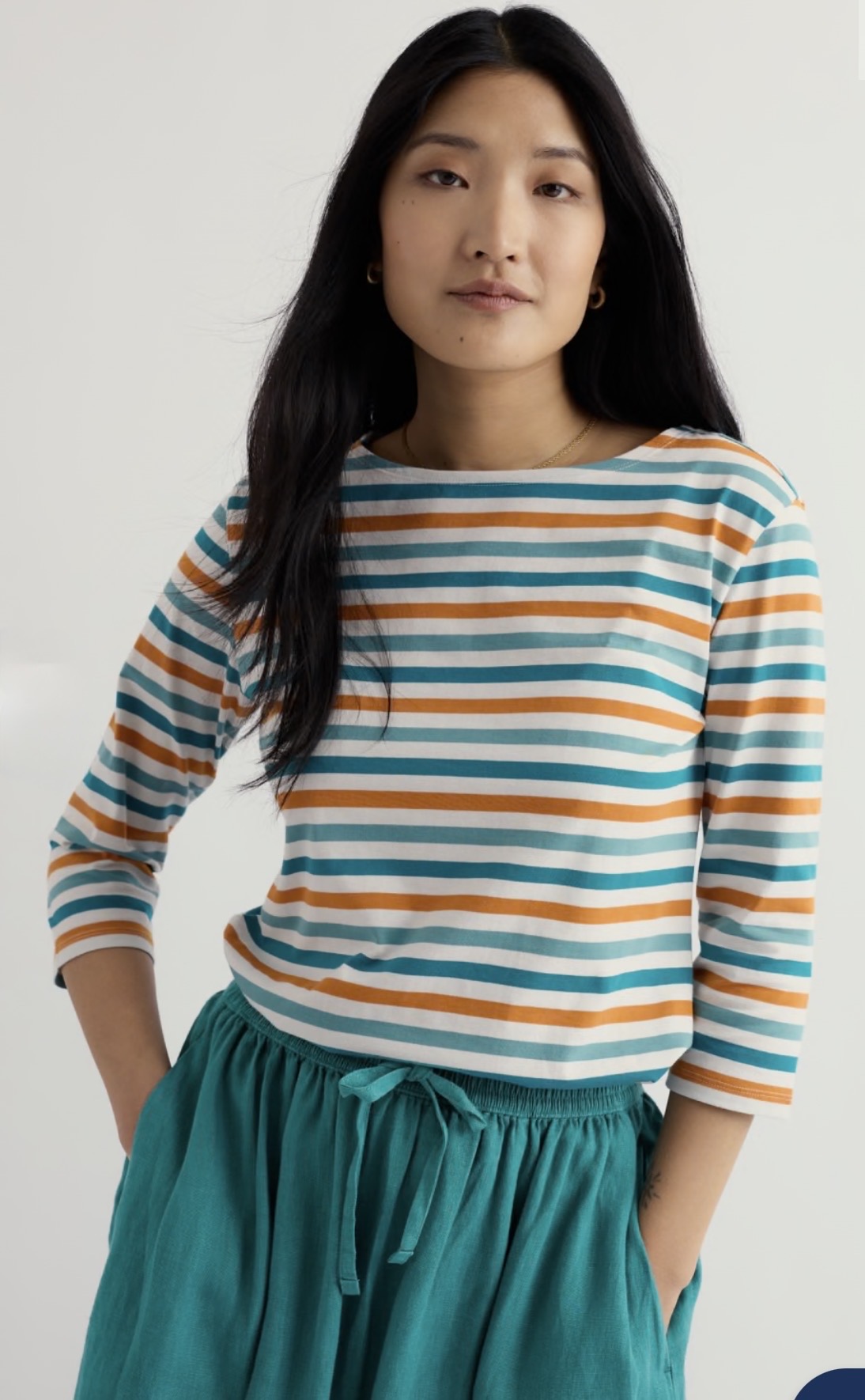 A 3/4 sleeve version of our classic sailor stripes, made with soft and breathable organic cotton, with an elegant boat neck and relaxed fit. The stripes come in a range of coastal colours, and are yarn-dyed for crisp vibrancy. Choose from a range of designs including slim Bretons and Falmouth stripes with a plain yoke. Effortless style perfect for layering. GOTS represents the gold standard of organic cotton, which is grown without harmful fertilisers and pesticides, protecting wildlife, soil quality and people.