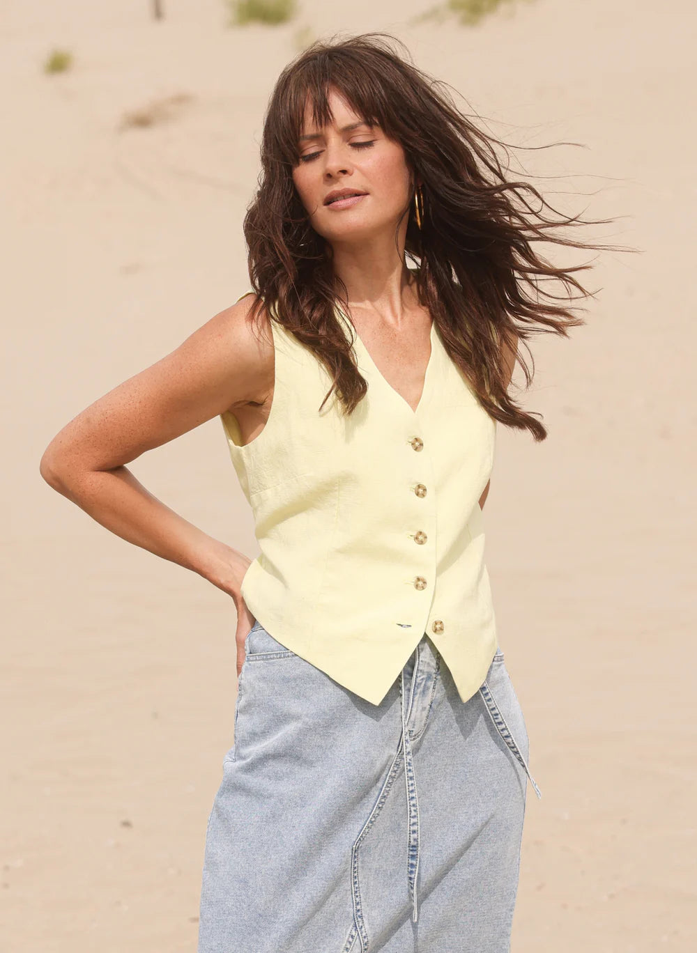 A summer waistcoat in linen-viscose quality. The model has a V-neck, button closure and an adjustable bow at the back. Wear the waistcoat on its own or in combination with the matching trousers. Available in two colours: pastel yellow and baked clay.